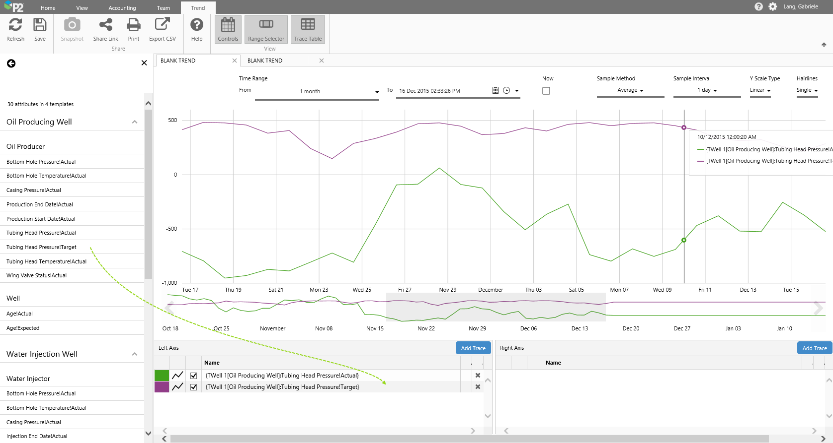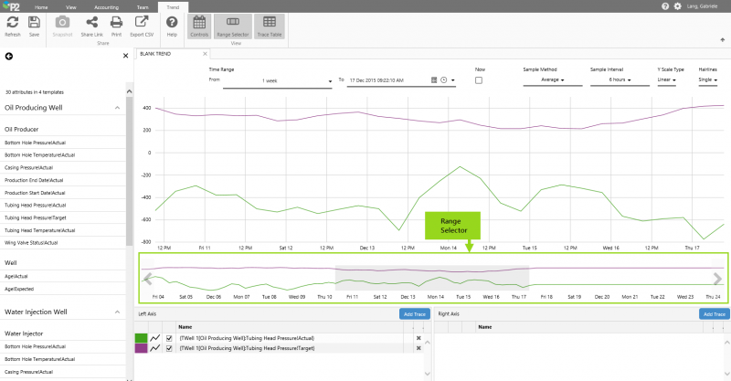 You can also type in a calculation, with the tag or attribute also surrounded by curly brackets {}, for example: {TWell 1:Tubing Head Pressure} + 20, or add a calculation to to an attribute or tag that you dragged onto the trend, by editing the value in the Trace Table.