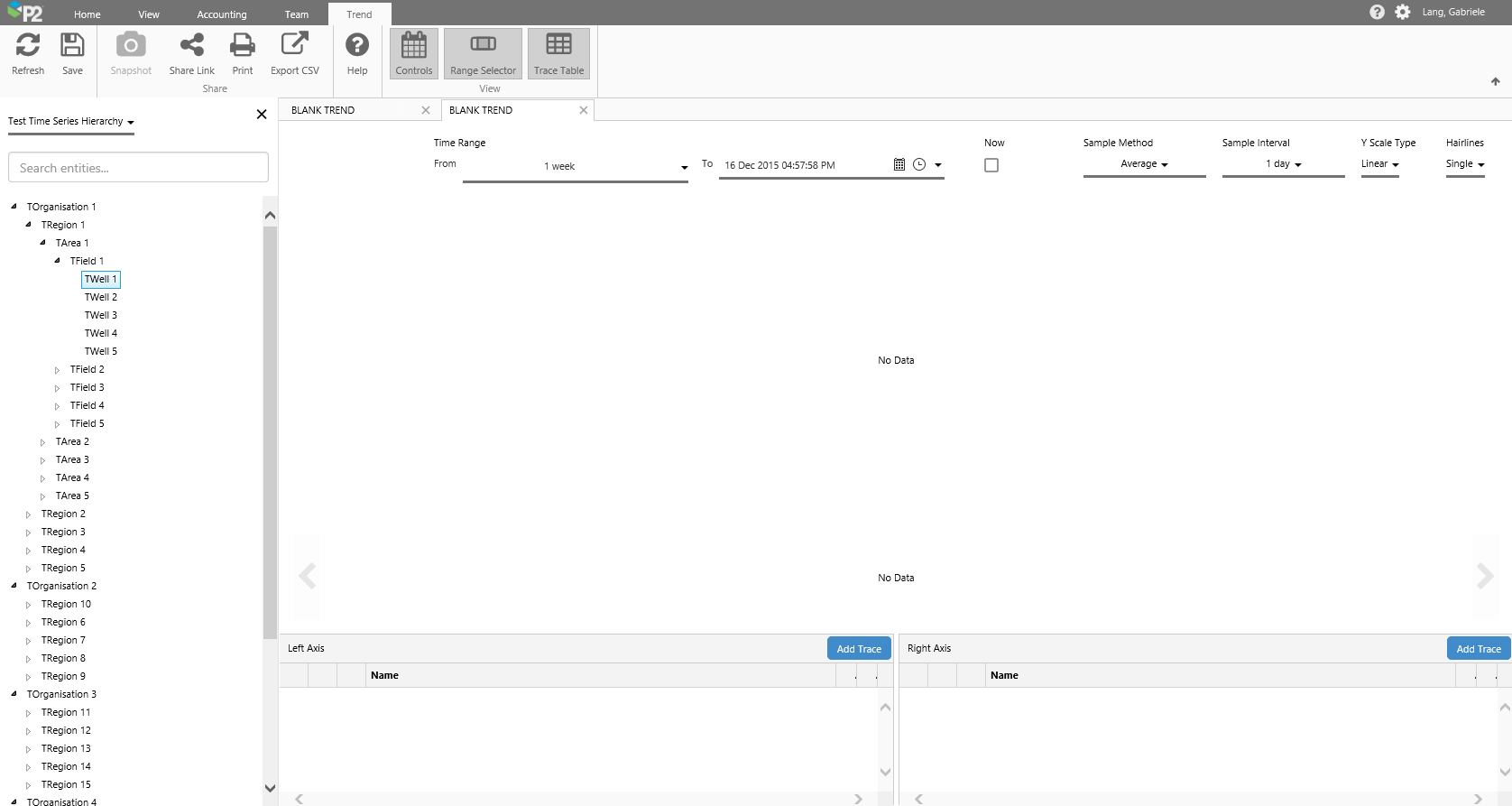 In our example tutorial, we select the Test Time Series Hierarchy, and navigate to the TWell1 entity: TOrganisation 1>TRegion 1>TArea 1>TField 1>TWell 1