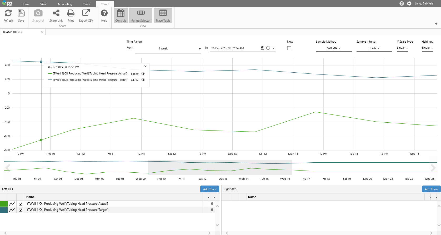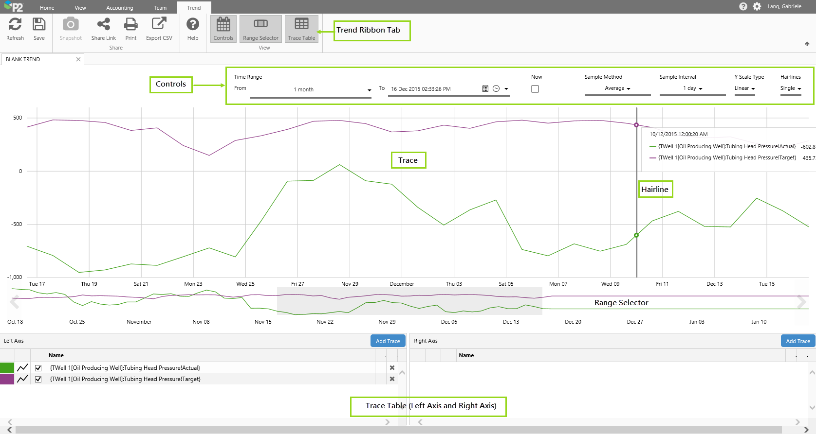 Controls The selections you make affect the time range of the chart, as well as how P2 Server fetches the data, and how the trace line is displayed.