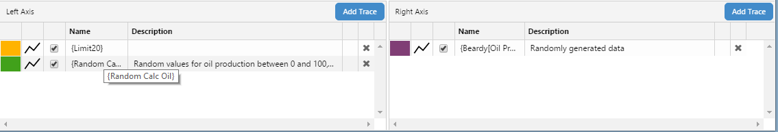 Data items here have a left axis. You can drag a data item to the Right Axis table to give it a right axis. This is the trace data, and could be a tag or attribute name, with or without a calculation, or it could even be a fixed number, such as 99.