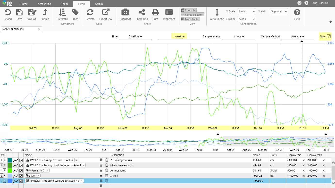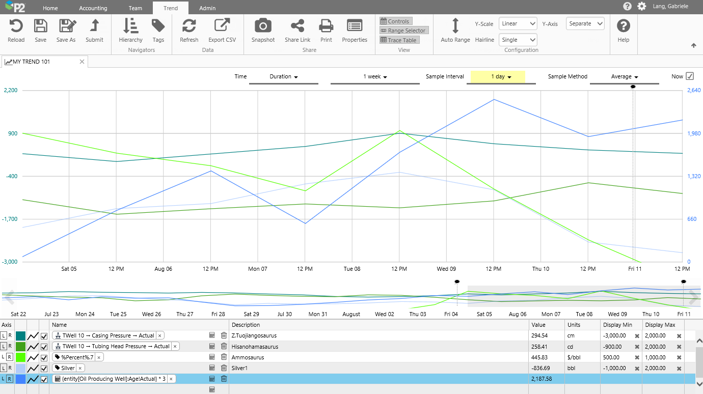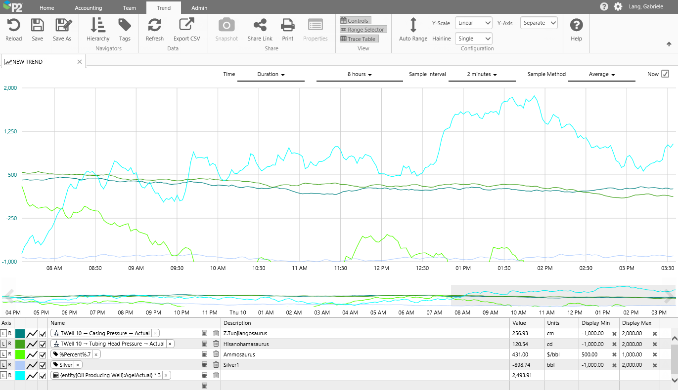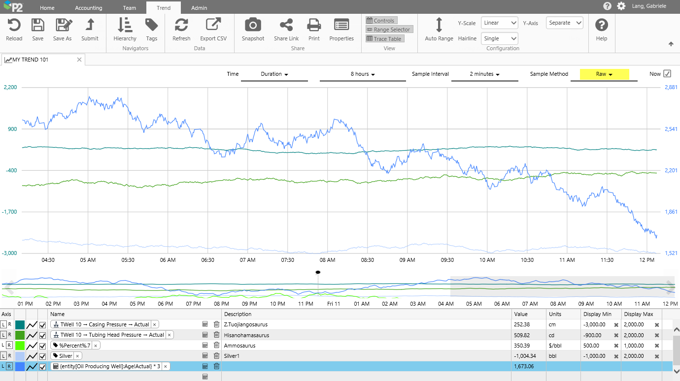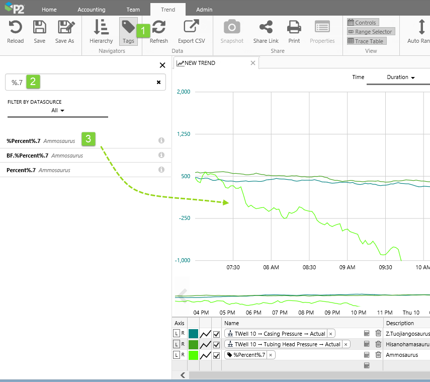 Typing in the name: If you know a tag or attribute name, you can type this directly into the name column, always surrounding the tag or attribute name in {curly brackets}. You can also type in a calculation, with the tag or attribute also surrounded by curly brackets{}, for example: {TWell 1:Tubing Head Pressure} + 20, or add a calculation to to an attribute or tag that you dragged onto the trend, by editing the value in the Trace Table. Here are some examples: