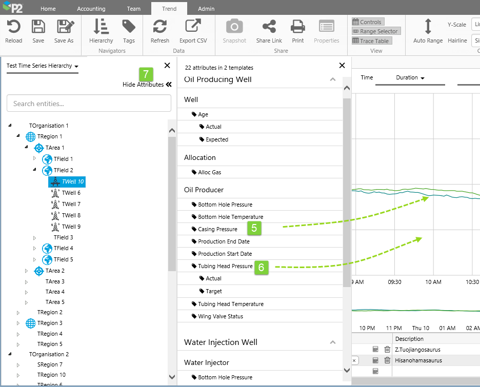 In our example tutorial, we select the Test Time Series Hierarchy, and navigate to the TWell10 entity: TOrganisation 1>