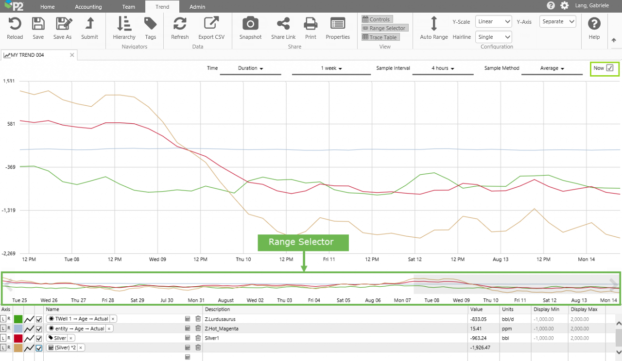 In this tutorial, we will change the time selections using the Range Selector, located below the Trace Window. The Range Selector works interchangeably with the Time trend controls to set your trend time range. The range selector has a highlighted section that matches the time range set by the date pickers, with double that time period shown before the selection if Now is selected (for example, for a new trend).