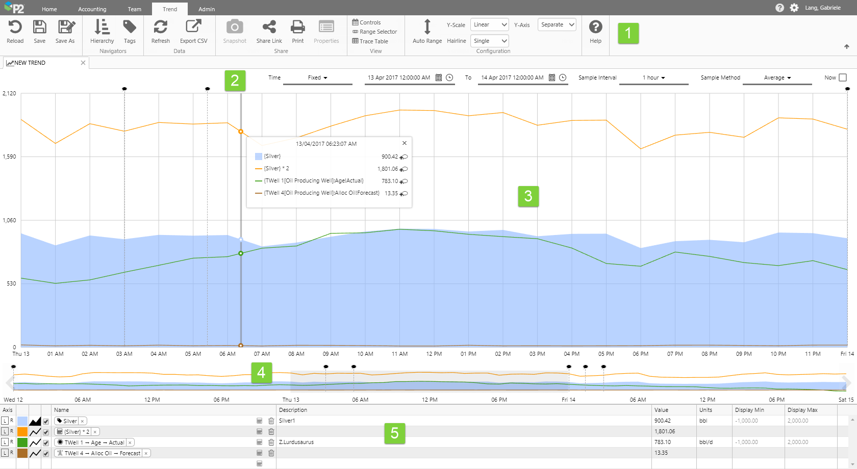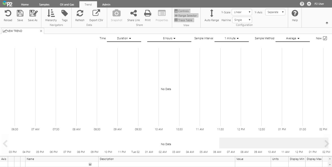 | 1. | Trend Ribbon Tab | The Trend Tab on the ribbon is activated whenever a trend is opened and is used for managing and sharing the trend, as well as refreshing data or resetting the trend, and choosing some of the trend configuration such as Y-Scale Type, number of allowable hairlines and what type of Y-Axis is used. Click Auto Range to reset the minimum and maximum values for the trace items, so that all data points are visible on the trend. This is also where you choose the Mode: (Times Series or XY). |