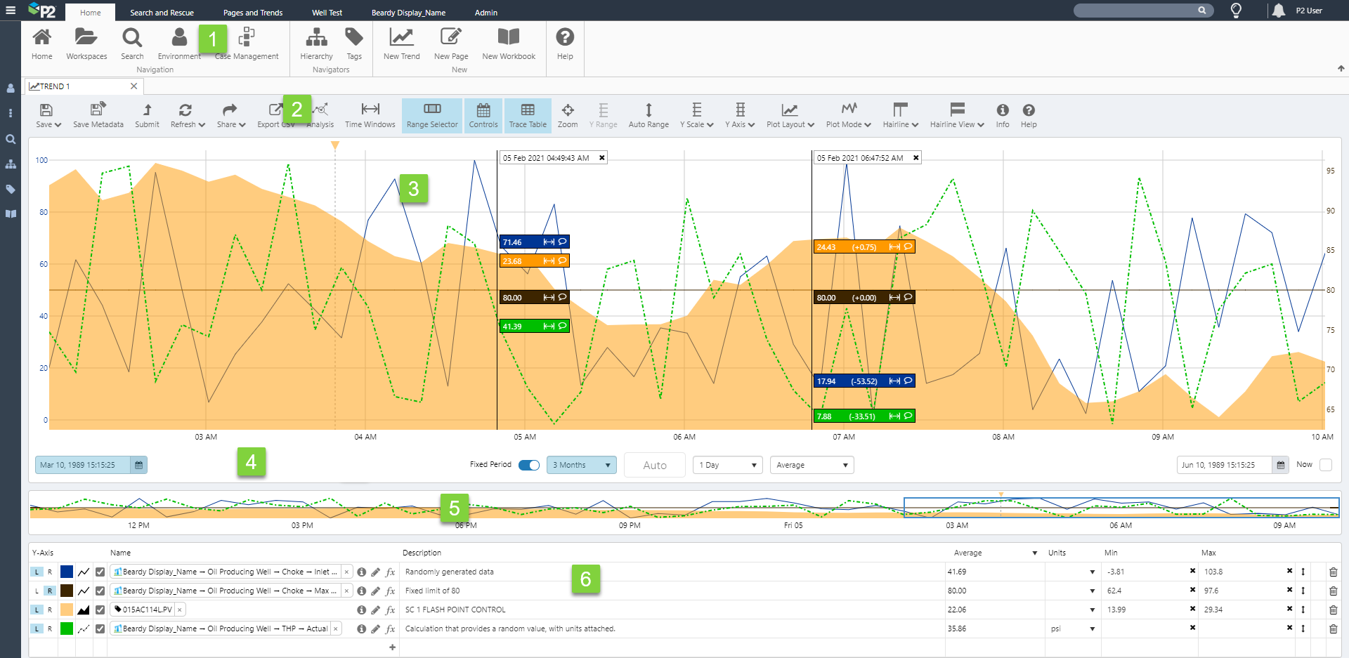 2. Trend Toolbar The Trend Toolbar is activated whenever a trend is opened and is used for managing and sharing the trend, as well as refreshing data or resetting the trend, and choosing some of the trend configuration such as Y-Scale Type, number of allowable hairlines and what type of Y-Axis is used. Click Auto Range to reset the minimum and maximum values for the trace items, so that all data points are visible on the trend.