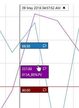 This feature is especially useful if you want a small chart/trend for selecting the hairline to be used in conjunction with one or more larger charts. For example, you could configure the hairlines on the smaller chart to show values only, and the hairlines on the larger charts to show values and timestamp.