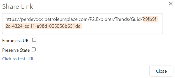 A trend that has been saved to My Workspace is assigned a Link Key that identifies the trend, and a State ID. The Link Key is represented by a long sequence of letters and numbers that identifies the trend. The State ID represents the current state of the trend, which is saved in the database with an incrementing ID every time this dialog box is opened.