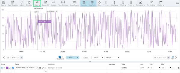 To create a trend link using Explorer, open the trend and then click the Share button on the Trend toolbar and select Share Link. This allows you to share the saved trend, or the current state of a trend (i.e. with the current selected options such as time range, sample interval, tags, calculations, etc.).