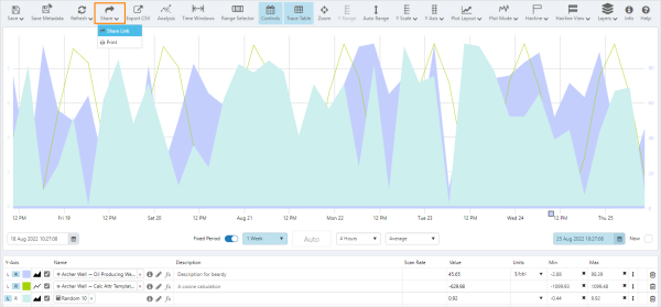 To create a trend link using Explorer, open the trend and then click the Share button on the Trend toolbar and select Share Link. This allows you to share the saved trend, or the current state of a trend (i.e. with the current selected options such as time range, sample interval, tags, calculations, etc.).