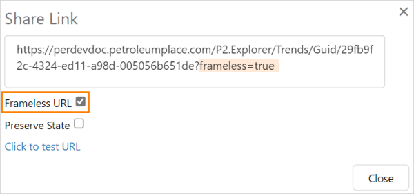Select Frameless URL to open the trend outside of the IFS OI Explorer framework. A frameless URL has the parameter frameless=true appended to the URL.