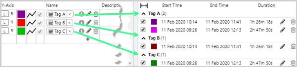 If a tag has multiple associated time windows, they will be grouped with each window in a different shade of the same colour.