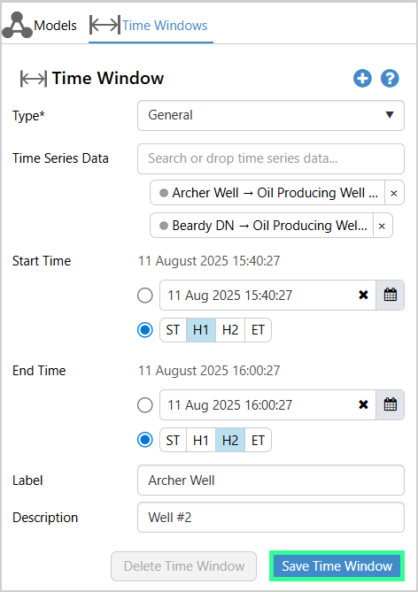 - You may change the data items and start/end time if you wish and optionally add a label and description to a Time Window.
