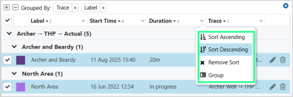 Sorting and grouping options are available from the column dropdown menus. You can apply ascending or descending sorts to multiple columns, and the order in which columns are selected determines the sorting precedence.