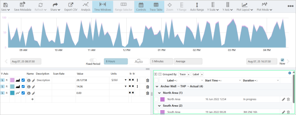 The Time Windows table can be toggled on and off by selecting the Time Windows button in the Trend toolbar; it is only displayed if the Trace Table is toggled on.