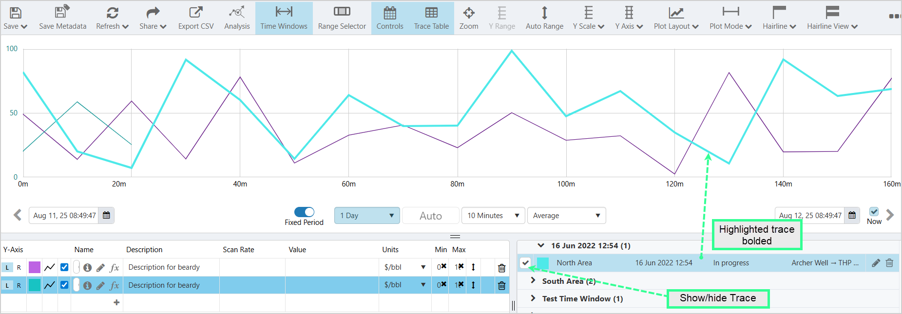 - When you click on it and highlight a Time Window in the table, the corresponding trace lines are bolded, for each data item in that time window.