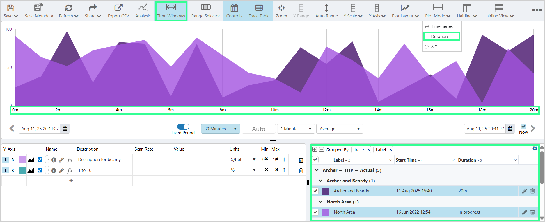 When the Duration mode is turned on, Time Windows are automatically enabled, with the Time Windows table being shown to the right of the Trace Table.