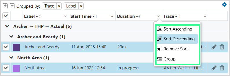 Sorting and grouping options are available from the column dropdown menus. You can apply ascending or descending sorts to multiple columns, and the order in which columns are selected determines the sorting precedence.