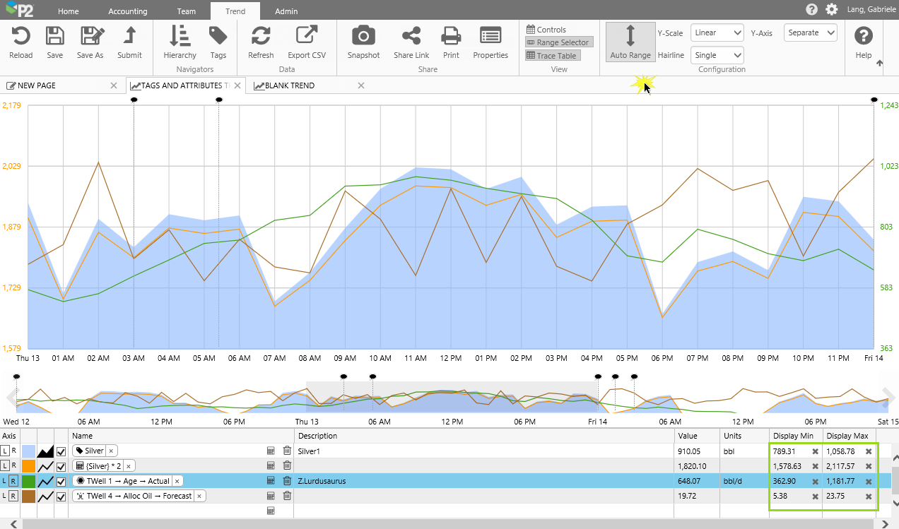Minimum and maximum display values for items in the trace table can be edited, and saved with the trend. The minimum and maximum values help to determine the Y-Axes.