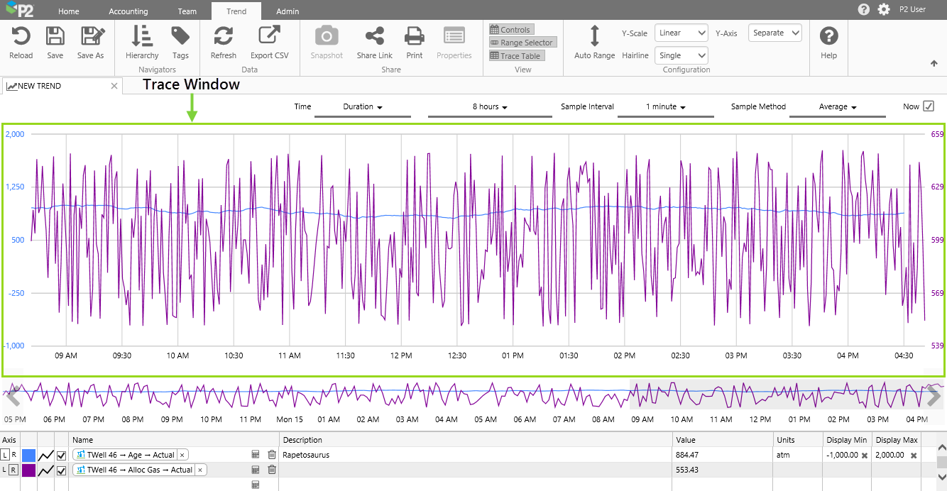 The trace window is the main area on the trend, and is used for showing the trace lines and adding comments.
