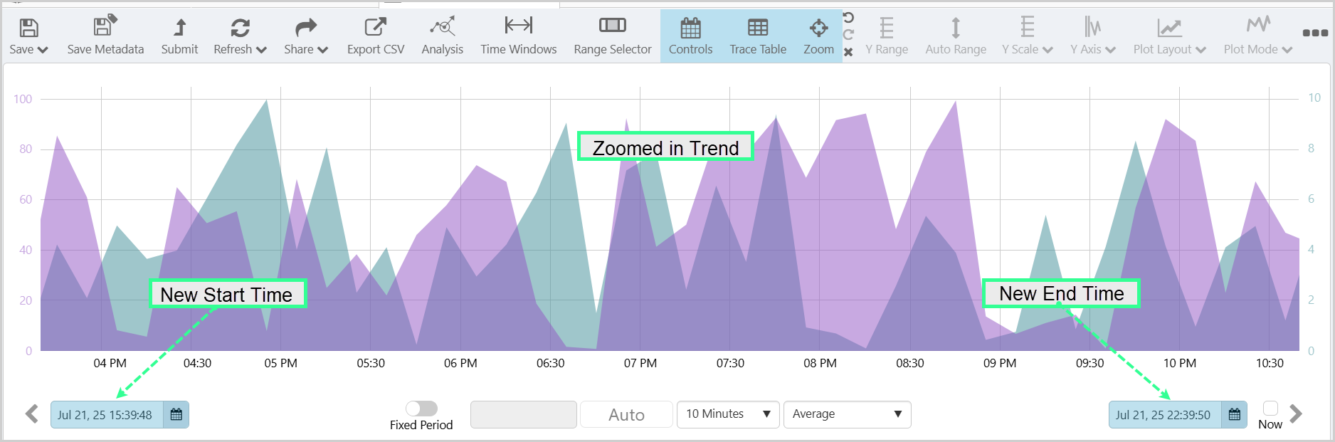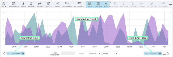 The Trend Controls, the Range Selector and the Zoom functions can all be used to set the time period of the trend.