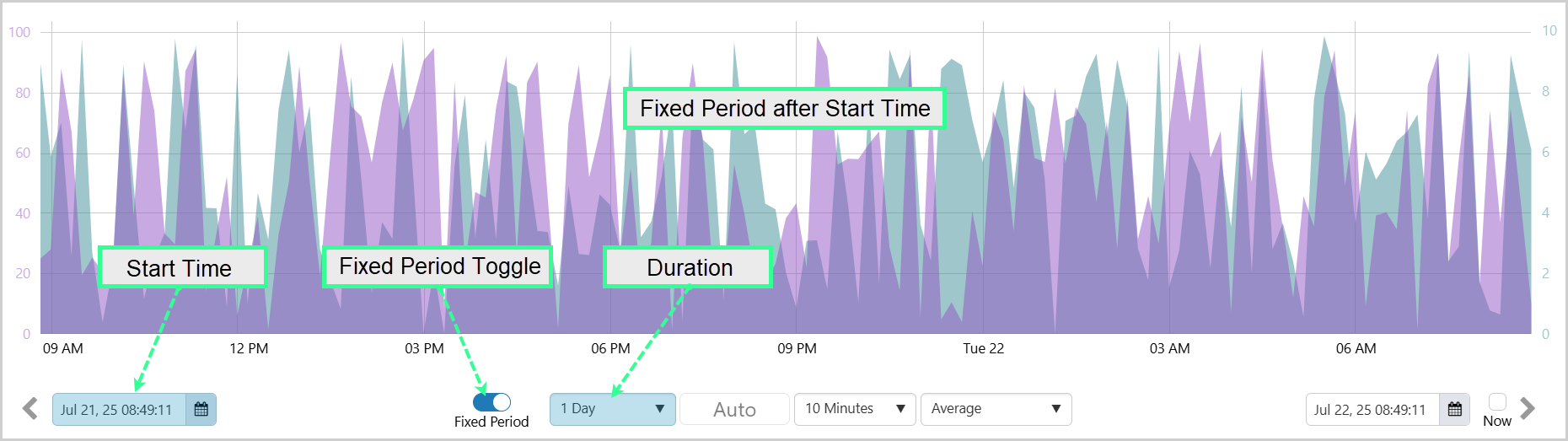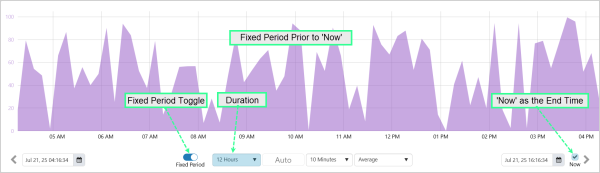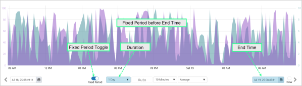 With Fixed Period toggled on and a Duration selected, the trend time range can be set as a fixed period of time beginning at the Start Time, or a fixed period of time finishing at the End Time.