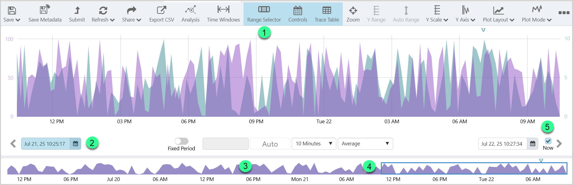 | 1. | Range Selector button | Toggle the button on the Trend Toolbar to display the Range Selector. |