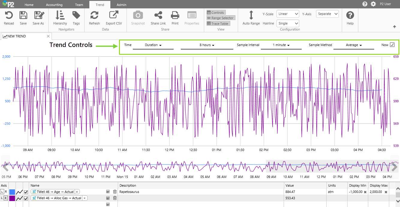 Adaptive Raw fetches far fewer data points from P2 Server (a maximum of 2000 points), yet renders a trend that is virtually identical to that produced when using the ‘Raw’ sample method (you may need to adjust the Sample Interval for Raw, to notice this).