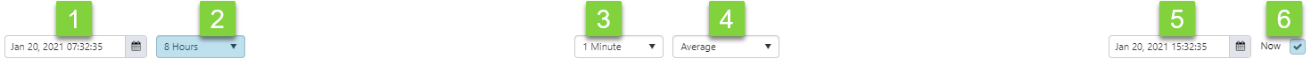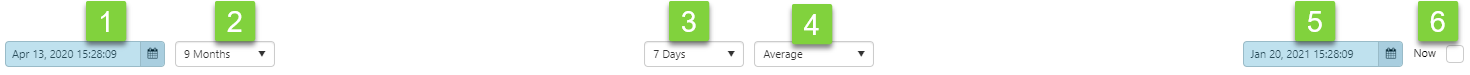 | 6. | Now | When you select Now, the trend end time is the current time. This refreshes at the Sample Interval rate (with 30 seconds as the lowest refresh rate). You can also click the Refresh button on the ribbon for an immediate refresh. (The table above this one shows the controls where Now is selected.) |