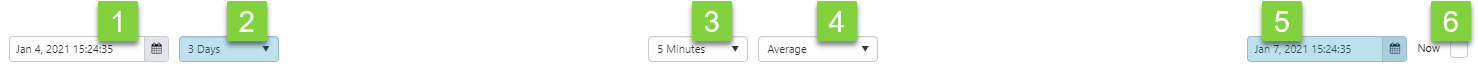 | 2. | Duration | This is the duration leading up to the current date and time (Now). To change the duration, select from the drop-down list (e.g. 8 hours, 3 days, 1 year). See Note above on how sample method and duration work together: Notes on the Trend Controls. |