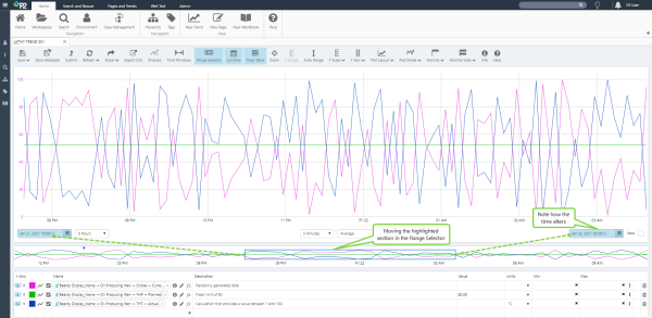 The Range Selector, located below the Trace Window, works interchangeably with the Trend Controls to set your trend time range. The Range Selector has a highlighted section that matches the time range set in the Start Time and End Time selectors, with double that time period shown before the selection if Now is selected (for example, for a new trend).