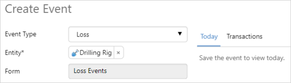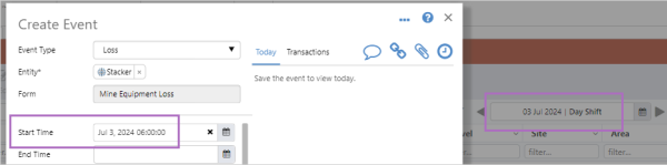 After selecting a site and area the New Event button is displayed. Click New Event to open the Create Event dialog.