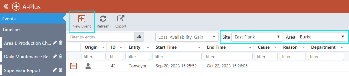 Note: The New Event button is only available after a site and area are selected.
