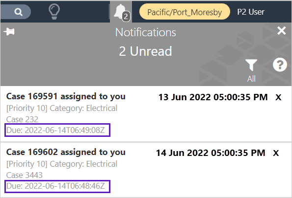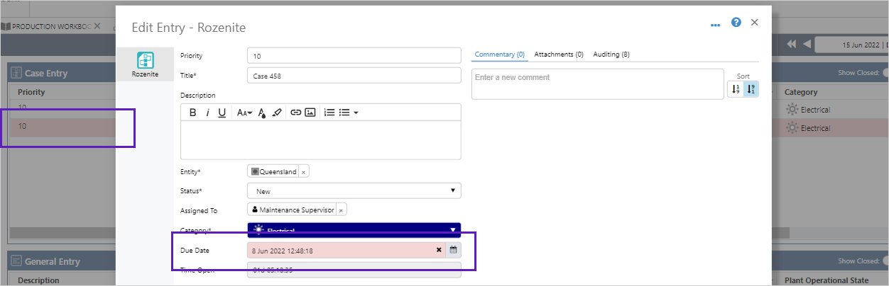 Overdue entries have a pale red background colour in the Shift Log and Case Management entry tables, and in the Due Date field in the entry dialogs.