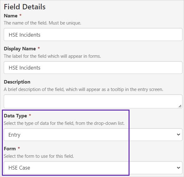 Field HSE Incidents is of type Entry and uses the form HSE Case: