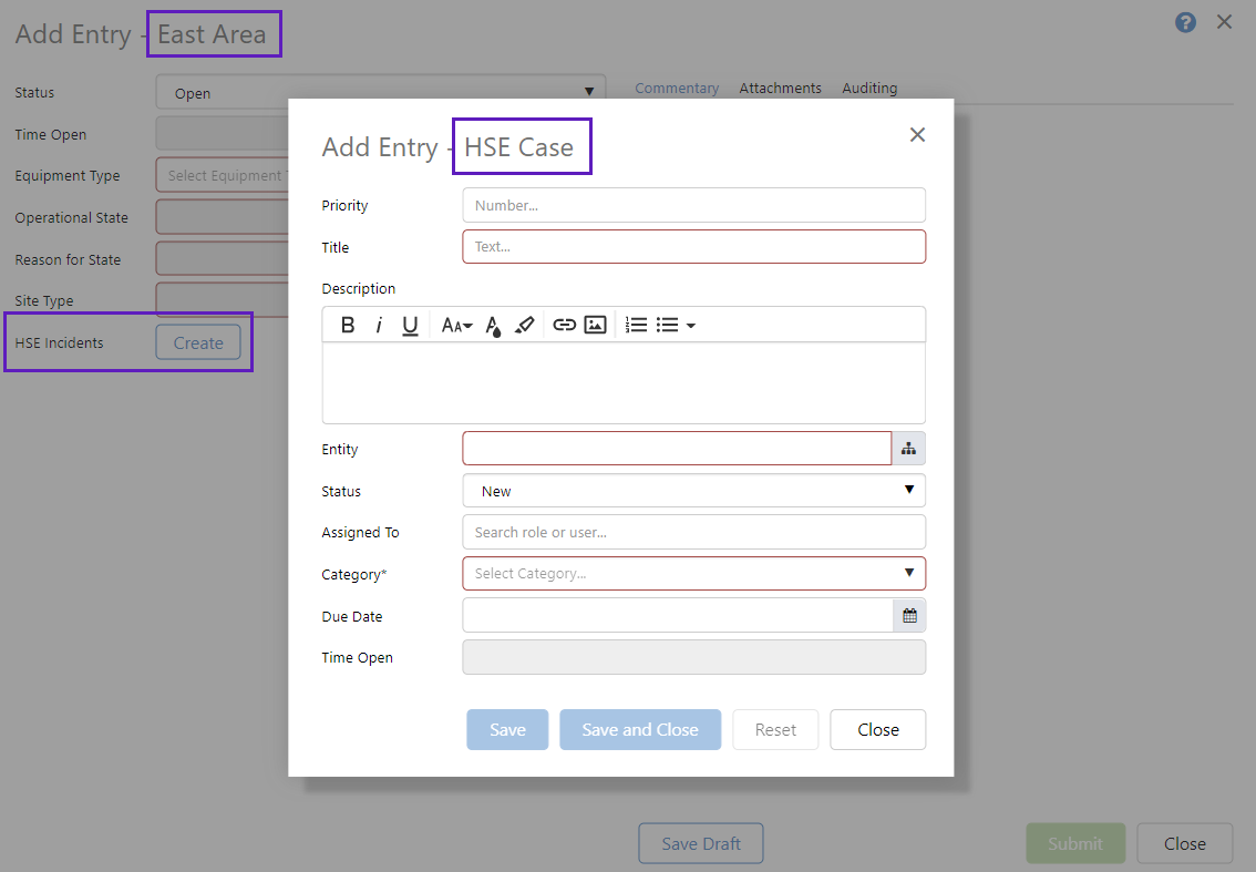 Entry Form HSE Case opened from HSE Incidents field in form East Area: