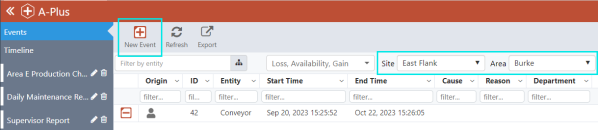 After selecting a site and area the New Event button is displayed. Click on New Event to open the Create Event dialog.