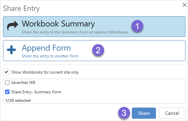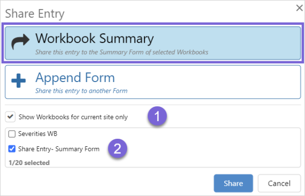 Entries can be shared to the summary table of one or more workbooks.