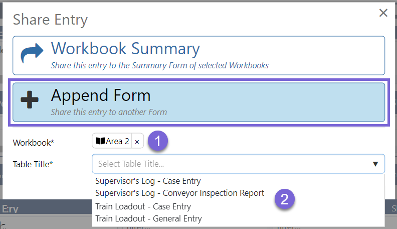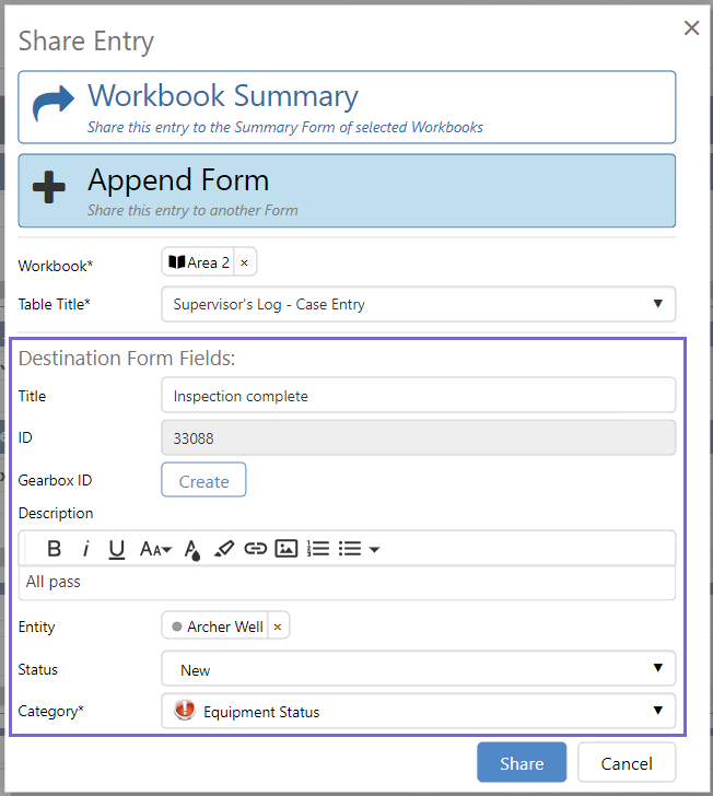 After the workbook and table are selected, the fields from the destination table form will be displayed in the share entry dialog.