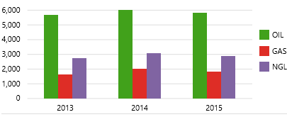 The Treemap shows relative values of numeric data as rectangles of different sizes, with an additional dimension represented by colour coding. So the size of the rectangular regions represent one dimension (e.g. oil produced) while the colours represent another dimension (e.g. water produced). Here is how to interpret the Treemap.