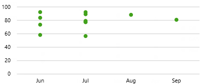 For example, the chart here shows downtime hours as points, with downtime shown as a dot. You would be able to tell immediately if there was a clustering of downtime events (lots of dots), in this case in June and July. |