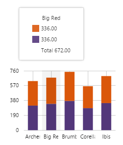 Discrete charts will usually (but not always) have tooltips enabled. When you hover over the chart data, the corresponding zone along the X axis is highlighted and a tooltip will appear. The tooltip shows the X axis value as the heading inside the tooltip, as well as a legend showing the data values.