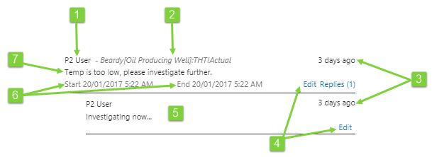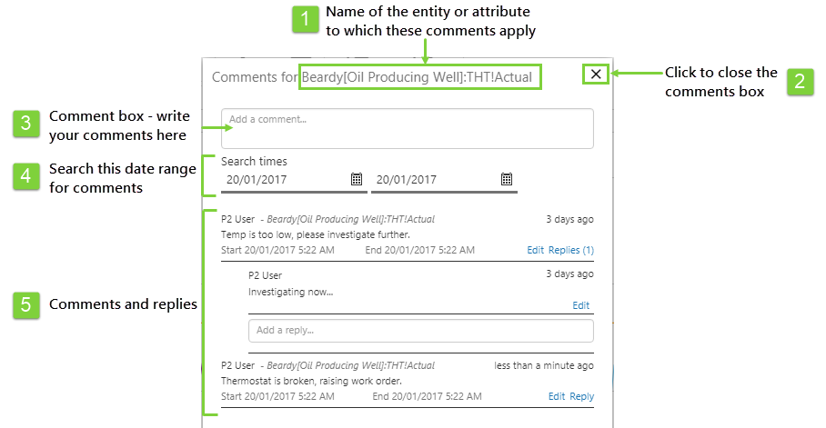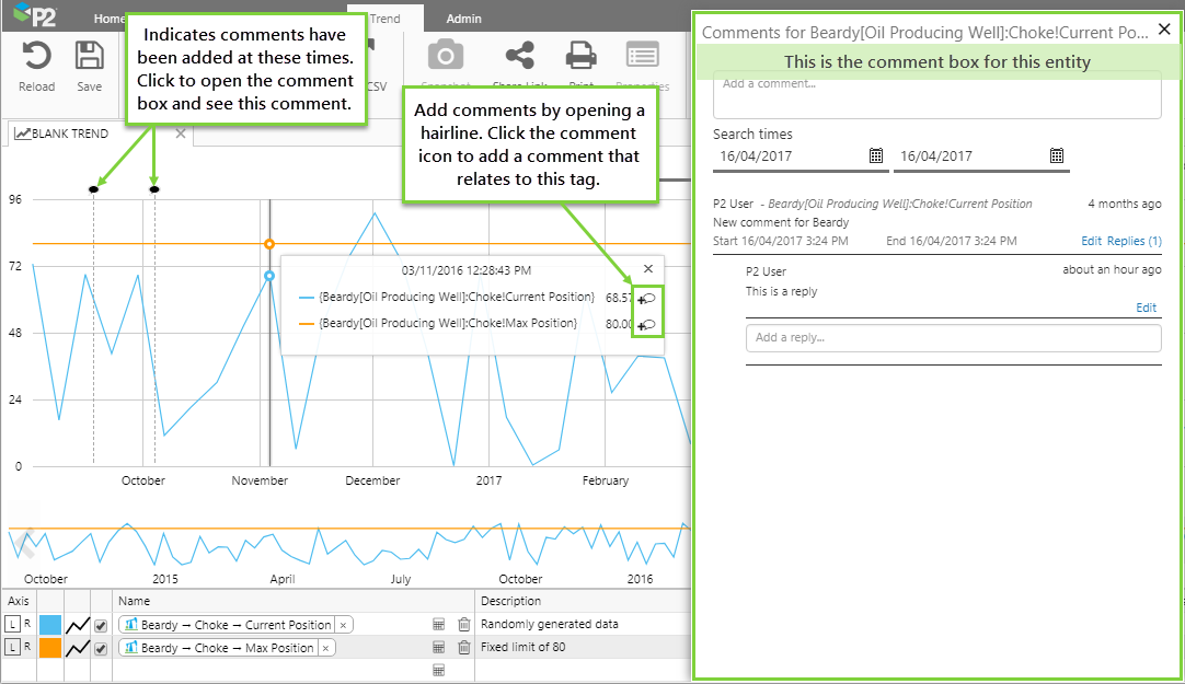 P2 Explorer trends and some pages allow you to enter comments about entities, attributes, tags, and calculation tags on a page or trend. This article describes how to identify comments and how to add them.