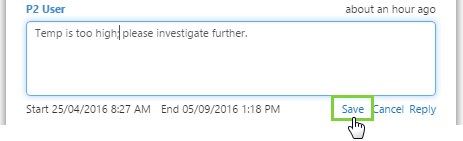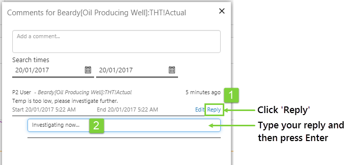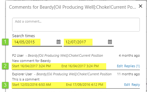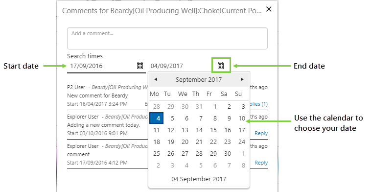 Note: The page designer may restrict commenting to a different period than the displayed search range. This may be linked to a date/time range selector on the page, or another type of time picker, and is dependent on how the page designer builds the page. The comment date is always shown within the comment itself.