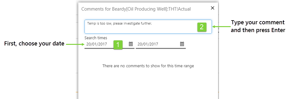 When you add a comment, it is added as being applicable to a certain date range. You can specify this date range in the 'Search times' fields, by choosing different start and end dates. If you want the comment to apply to a specific date only, you can set the start and end date to be the same.