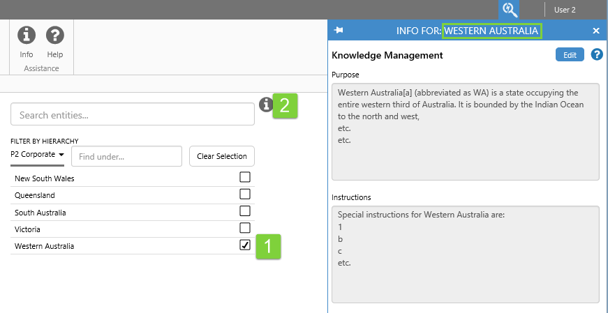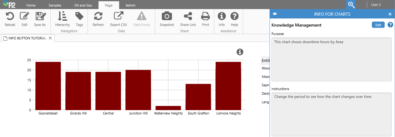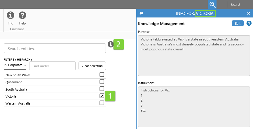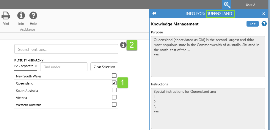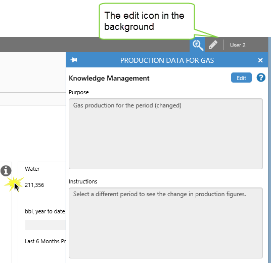 A page can have several info buttons, each with Knowledge Management designed to be relevant to its context, or its physical area on the page.