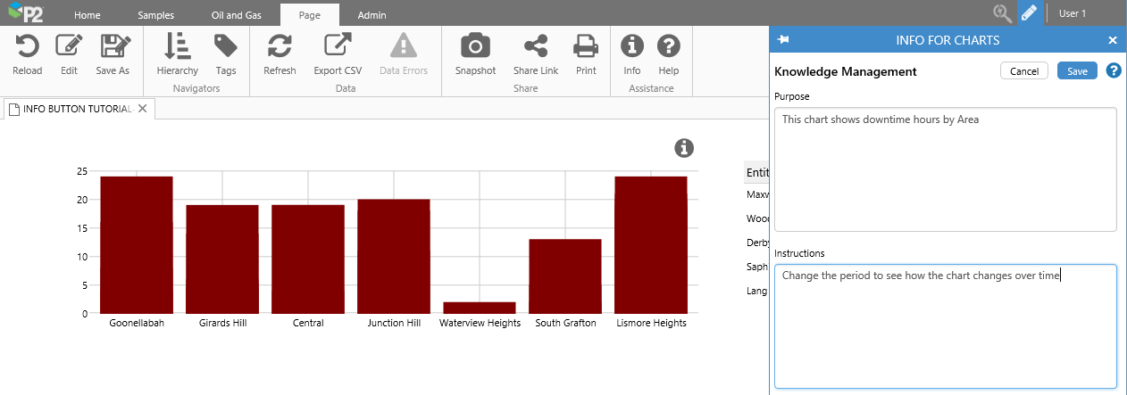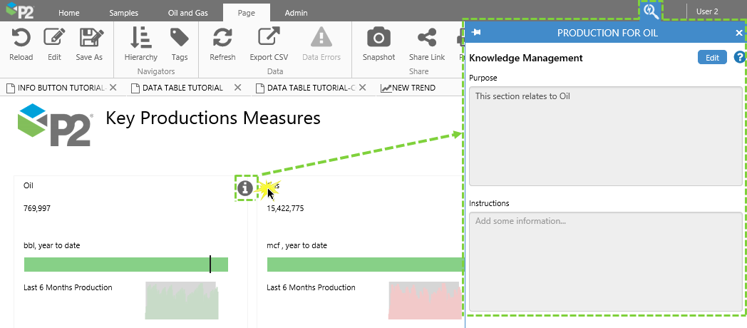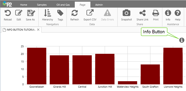 The Info Button is used to share contextual information for an area of your page. This information is available to all users of the page, for viewing or editing.