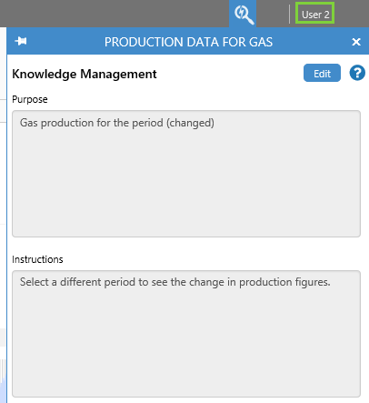 | User one edits the Knowledge Management fields for an Info button. | User two views the same Knowledge Management fields for the Info button. |