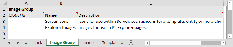 If you want to create images and image groups as part of a bulk configuration, you need to use the following tabs in the Import/Export spreadsheet: