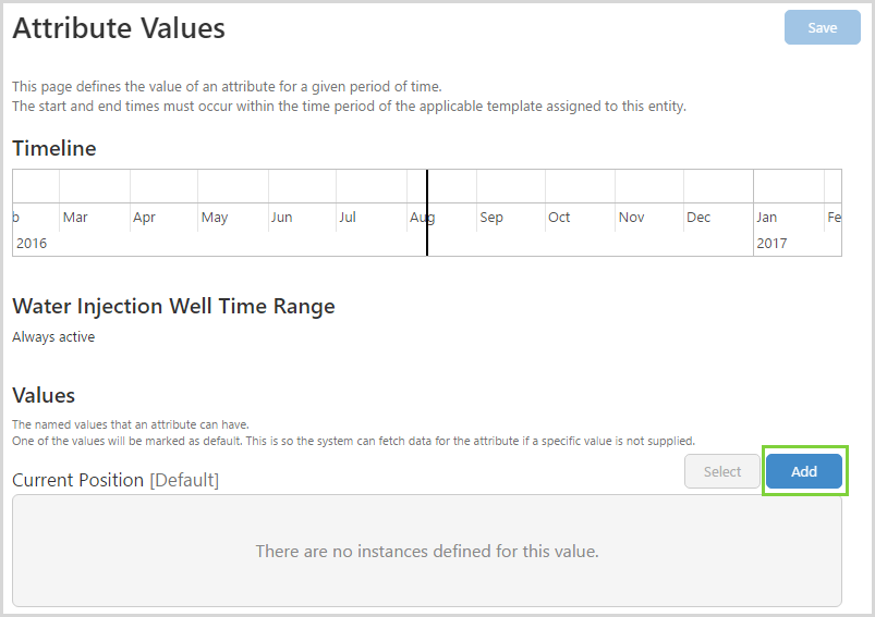 The Attribute Values page opens. As attributes are also time-aware, this page contains a timeline view similar to the one on the templates page.