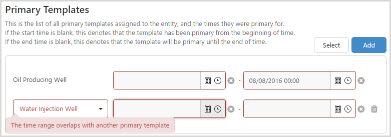 Note also that the time ranges available for an attribute are tied to the time range of the template instance, and cannot extend beyond the template instance's start or end times. Date ranges for individual attribute values cannot overlap.